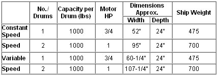 4. Constant speed drive: 144RPM which rotates 55-gallon drum at 37RPM. Note: To compute revolving speed of other containers, multiply diameter of wheels by RPM of wheels and divide by diameter of container.